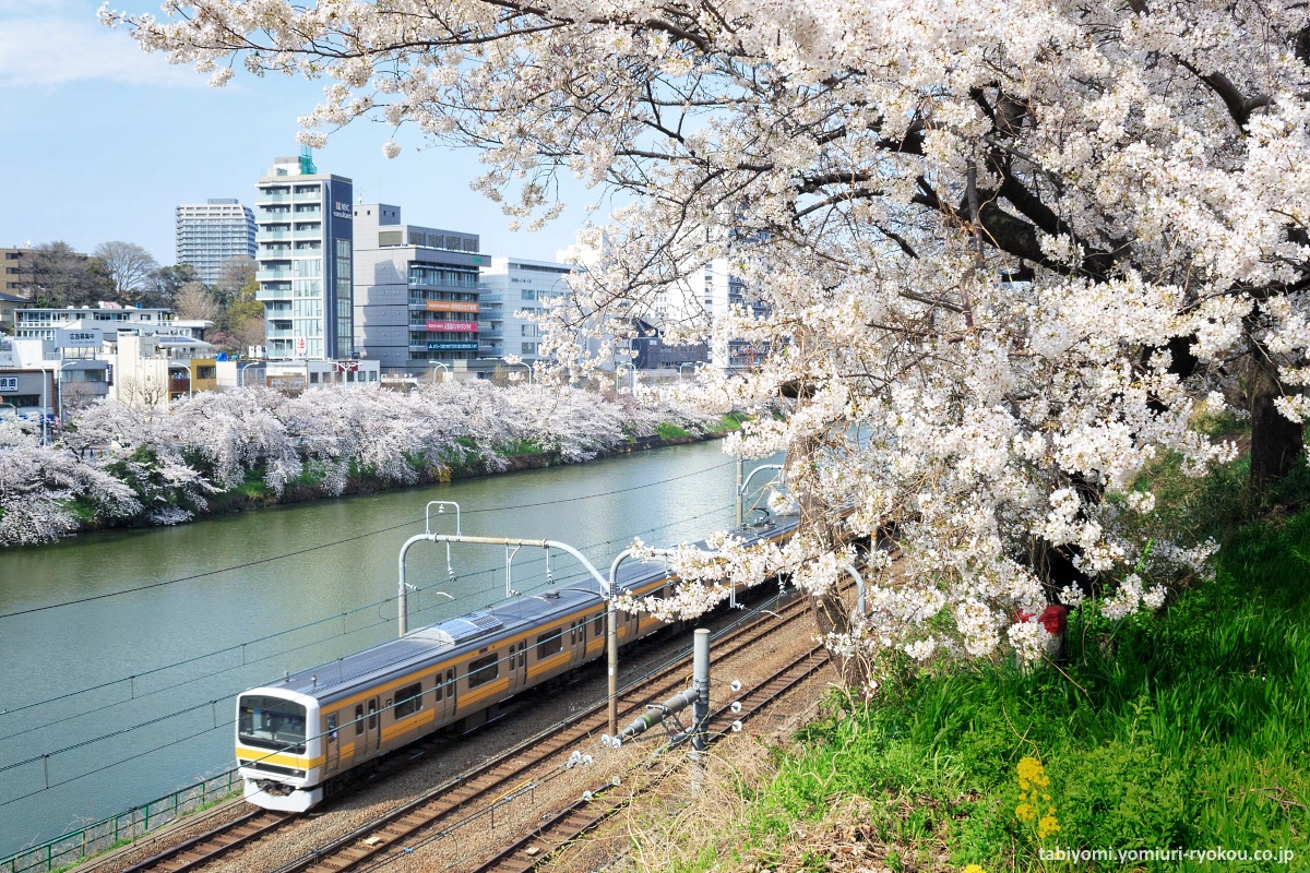 Aquí, los cerezos se inclinan sobre el agua mientras los trenes de la línea Chūō (中央線) pasan al otro lado del río, creando una escena muy propia de los anime.