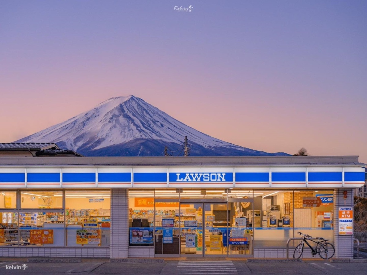 Se trata de una vista del majestuoso volcán tras el cartel de una tienda Lawson, una de las cadenas de konbini omnipresentes en Japón.