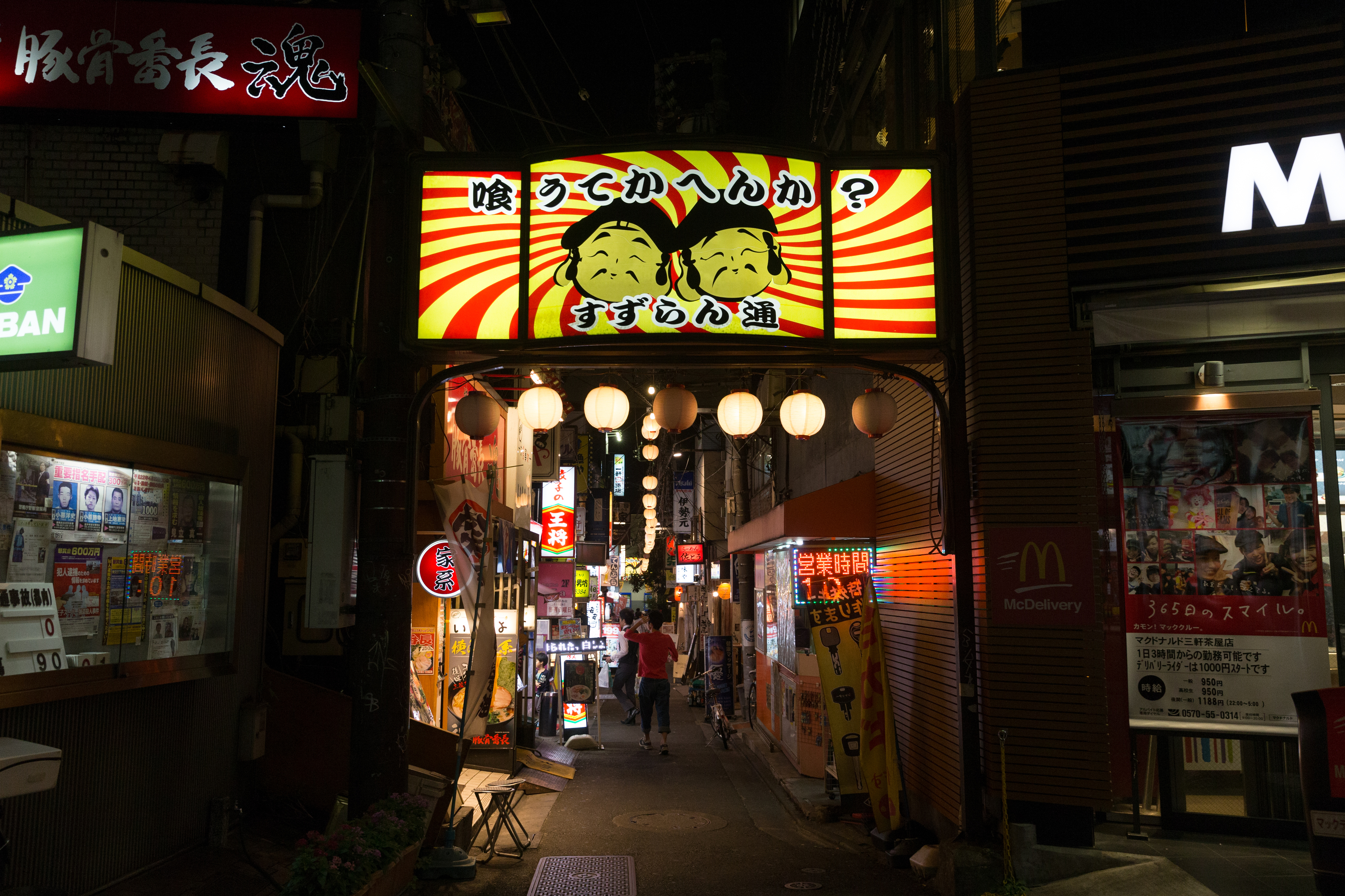 El área conocida como Sankaku Chitai (Triángulo de las Tres Esquinas) es famosa por sus calles angostas llenas de pequeñas tabernas y bares iluminados por farolillos.