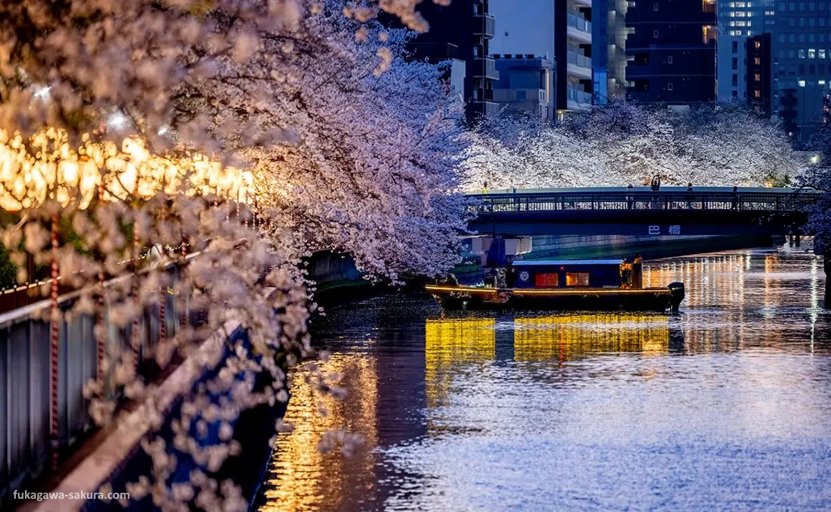 Los cerezos situados a lo largo del río son iluminados para crear una atmósfera preciosa y una oportunidad de realizar paseos nocturnos muy románticos.